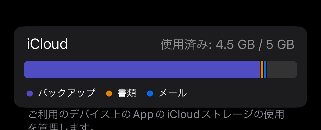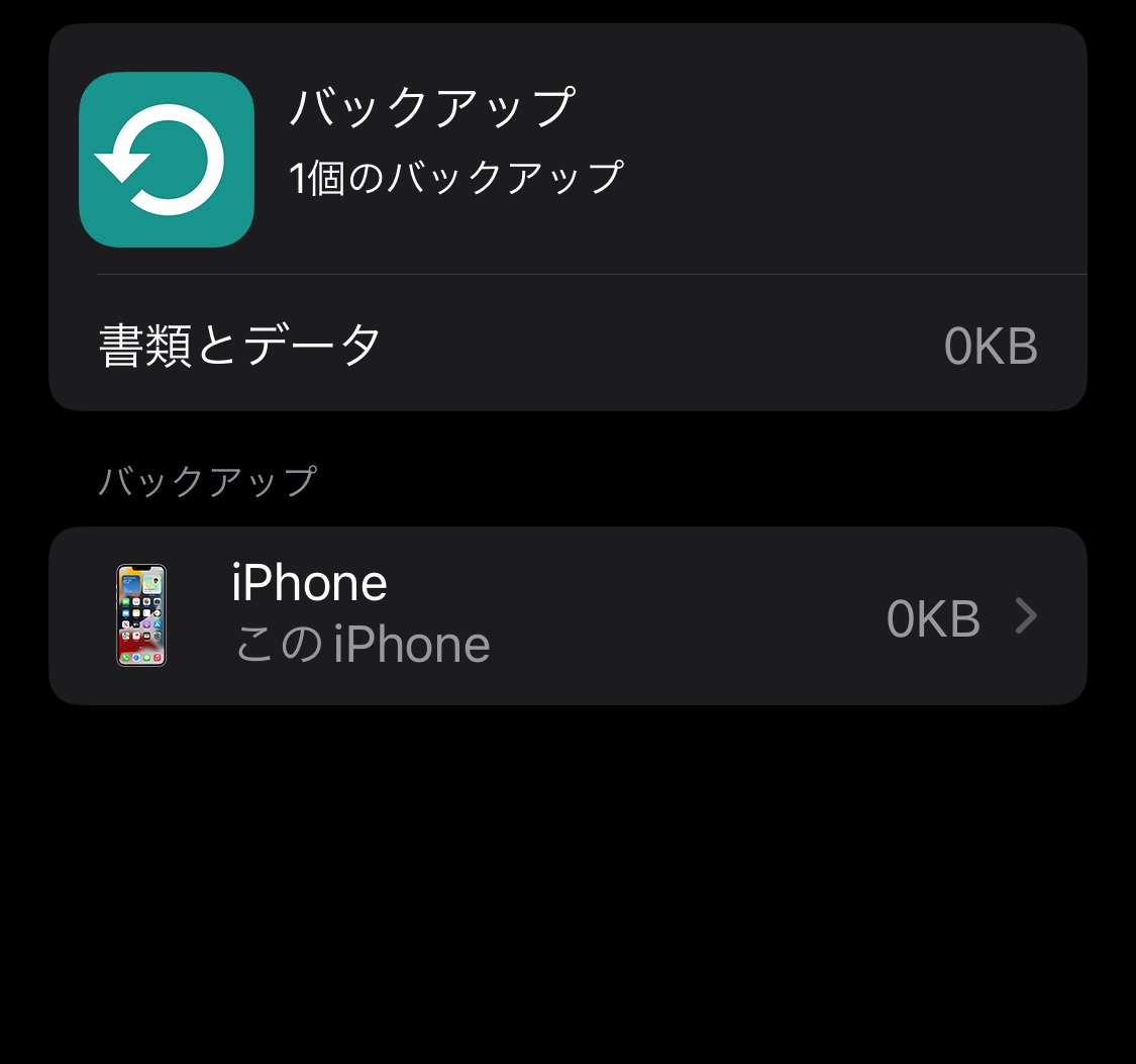 iPhone での iCloud - 内訳のバックアップのサイズは 0KB なのに、iCloud の全体で表示されるのバックアップの容量は 4.4G となっており、バックアップが半年ほどできていない