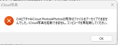iCloud for windowsを再インストールして設定しようとすると、”D:¥ピクチャー¥iCloud Photos¥Photo の既存のファイルをアーカイブできませんでした。iCloud 写真を起動できません。コンピューターを再起動してください”というメッセージが出て写真データが同期できない。ブラウザーでiCloudにログインして写真の更新閲覧問題ありません。住所録、カレンダーはOutlookと同期していて問題ありません。