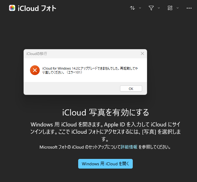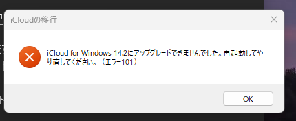 さらに続けると”iCloud for Windows 14.2にアップグレードできませんでした。再起動してやり直してください。(エラー101)”というメッセージになりiCloud 設定画面が出てこなくなる。インストールされているバージョンは14.2.96.0と表示。