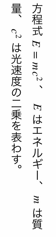 ご指摘のところ、読んでみたのですが、ぼくの理解の範囲では、残念ながら思い通りの結果を得ることができませんでした。数式(LaTeX)もだめでした。結局、横方向に回転させないでそのままにしておくことにしました。そのままでも誤解されることは無いと思います。