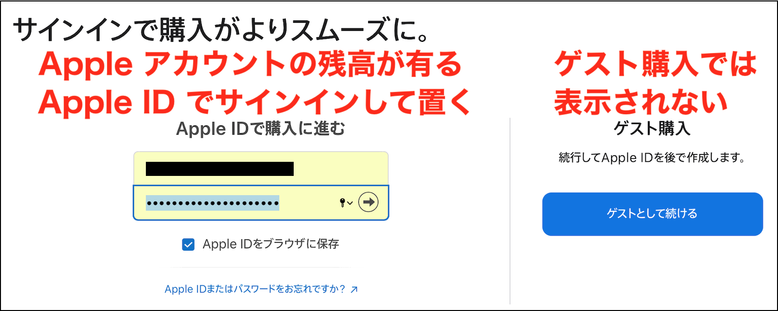 Apple Store に、Apple アカウントの残高が有る Apple ID でサインインしている場合は、下の画像の様に「ご希望の支払い方法は?」の画面に Apple アカウントの残高が表示されますので、適用する金額の入力欄に支払い金額を入力し、「適用」のリンクをクリック して下さい。