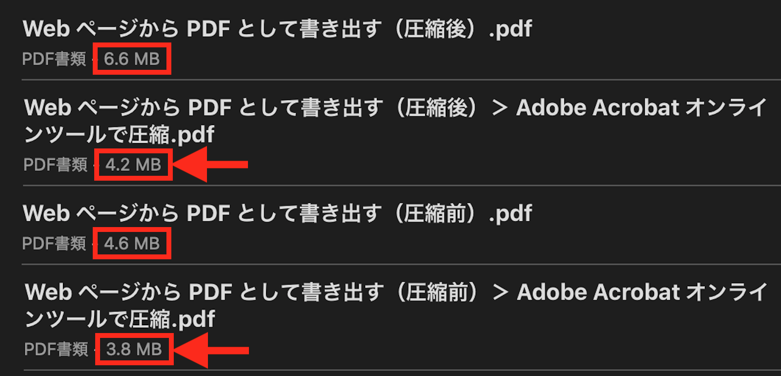 Web ページから PDF として書き出した、テキストメイン(ほぼテキストのみ)の PDF を圧縮した PDF ファイル(6.6 MB)を、「Adobe Acrobat オンラインツール」で圧縮すると 4.2 MB まで圧縮されましたが、Web ページから PDF として書き出した時点(圧縮前)のファイルサイズが 4.6 MB ですので、実際には 0.4 MB 程度しか圧縮されていません。
