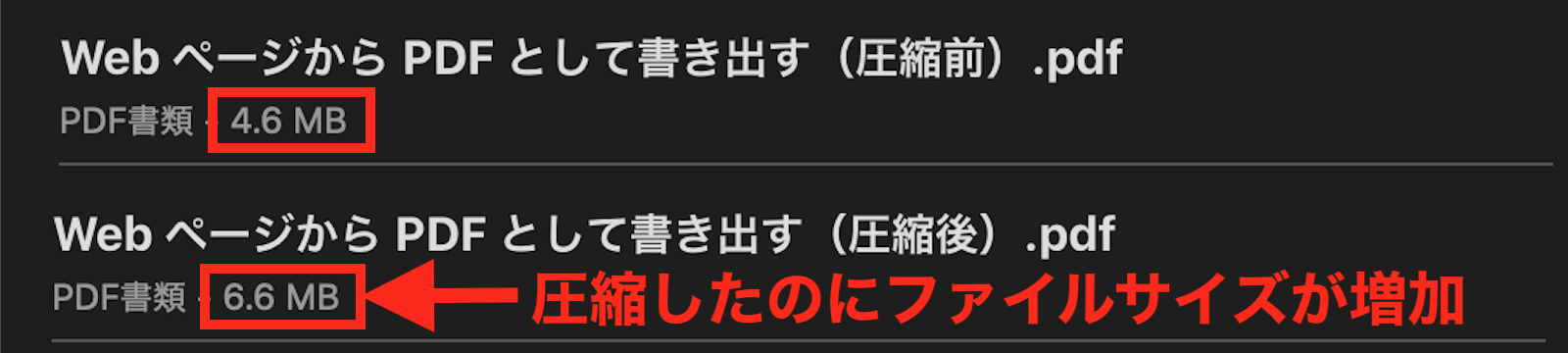 私の環境でも、スキャナーで読み込み PDF に変換した場合、及び Web ページから PDF として書き出したのが、画像メイン(画像を多用)の PDF の場合は、問題無く圧縮されますが、Web ページから PDF として書き出したのが、テキストメイン(ほぼテキストのみ)の PDF の場合は、下の画像の様に圧縮後のファイルサイズが圧縮前のファイルサイズより増加する現象が発生 します。