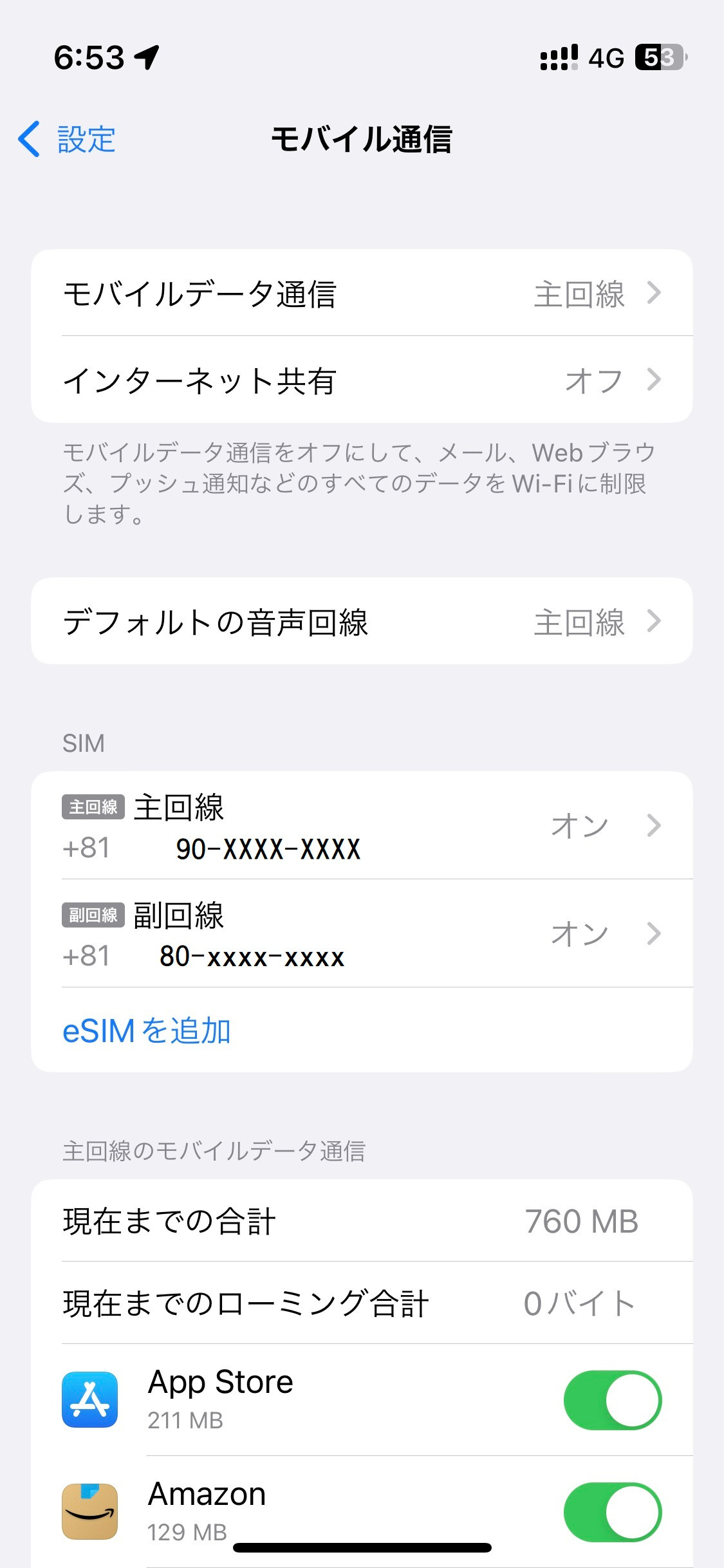 eSIMの追加をしてから数日経った頃、設定→モバイル通信を確認すると