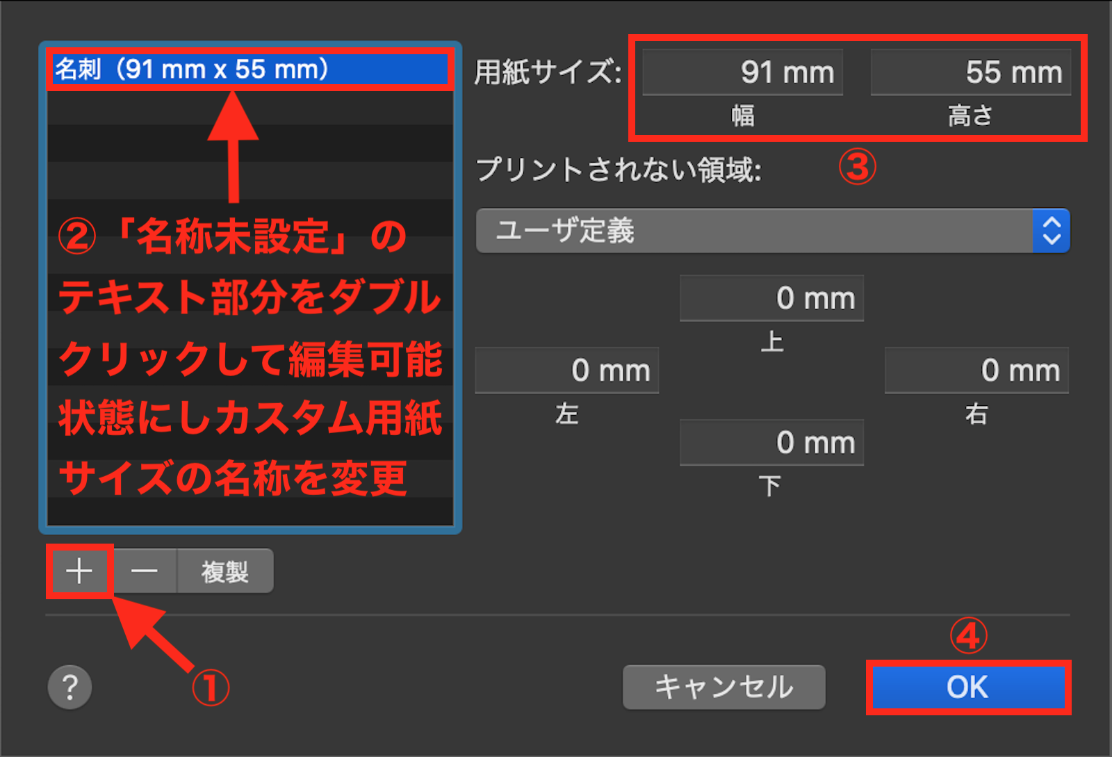 3.表示されるカスタム用紙サイズの設定パネルで、左下の「+」ボタンをクリックしてカスタム用紙サイズを追加し、追加された「名称未設定」のテキスト部分をダブルクリックして編集可能状態にし、カスタム用紙サイズの名称を「名刺(91 mm x 55 mm)」等に変更して、右下の「OK」ボタンをクリック。