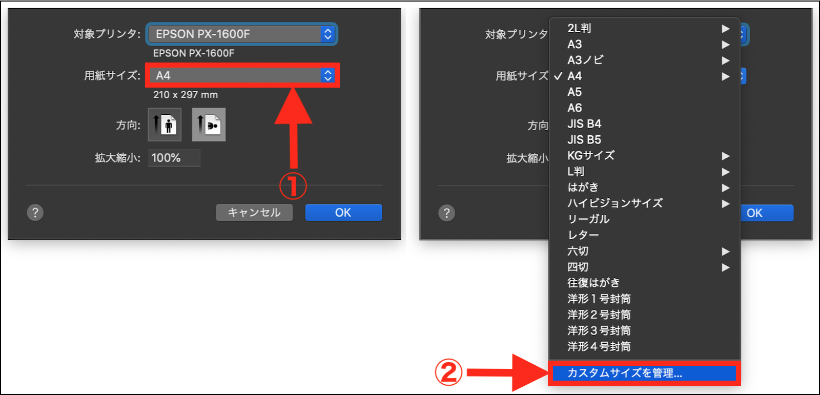 2.「ファイル」メニュー >「ページ設定」を選択すると表示されるプルダウンパネルで、「用紙サイズ」の選択メニューから、一番下に有る「カスタムサイズを管理」を選択。