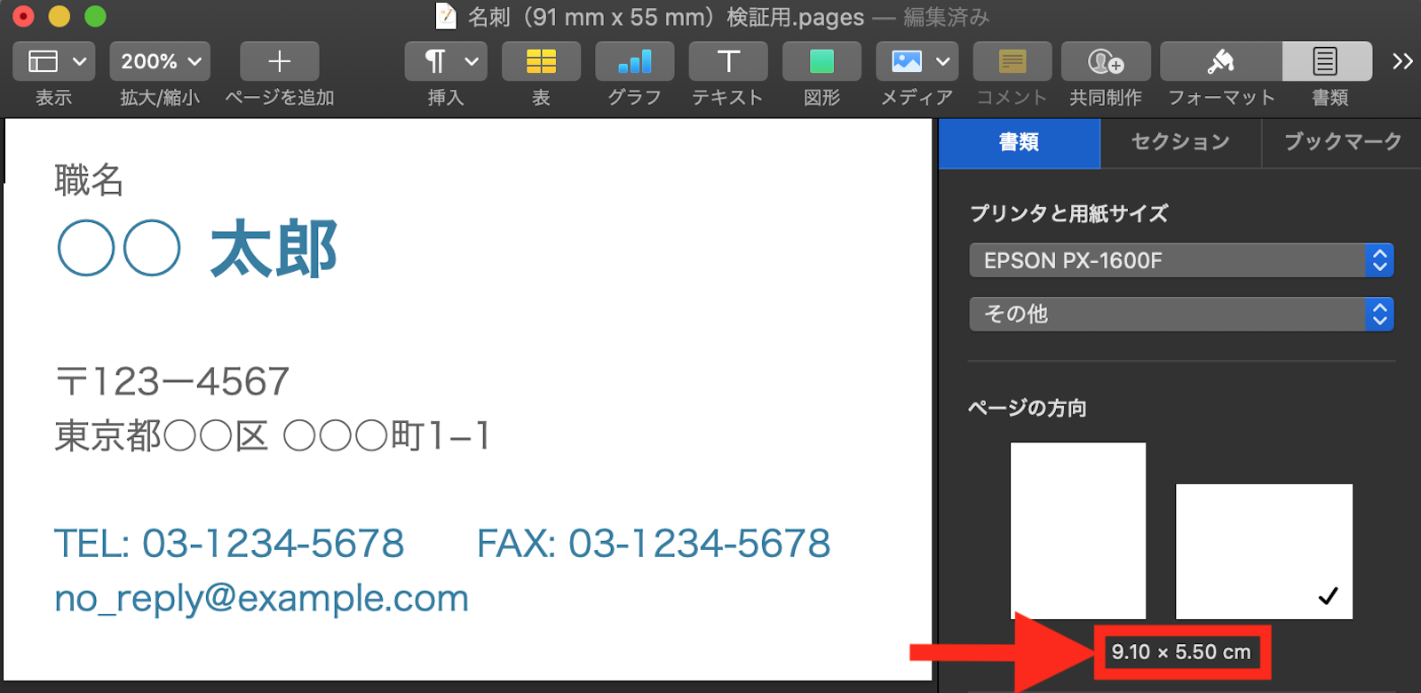 これで「Pages」書類の用紙サイズが 91 mm x 55 mm に設定されましたので、名刺のデザインを作成後、「ファイル」メニュー >「書き出す」で、データの入稿先が指定するフォーマットで書き出せば宜しいかと思います。
