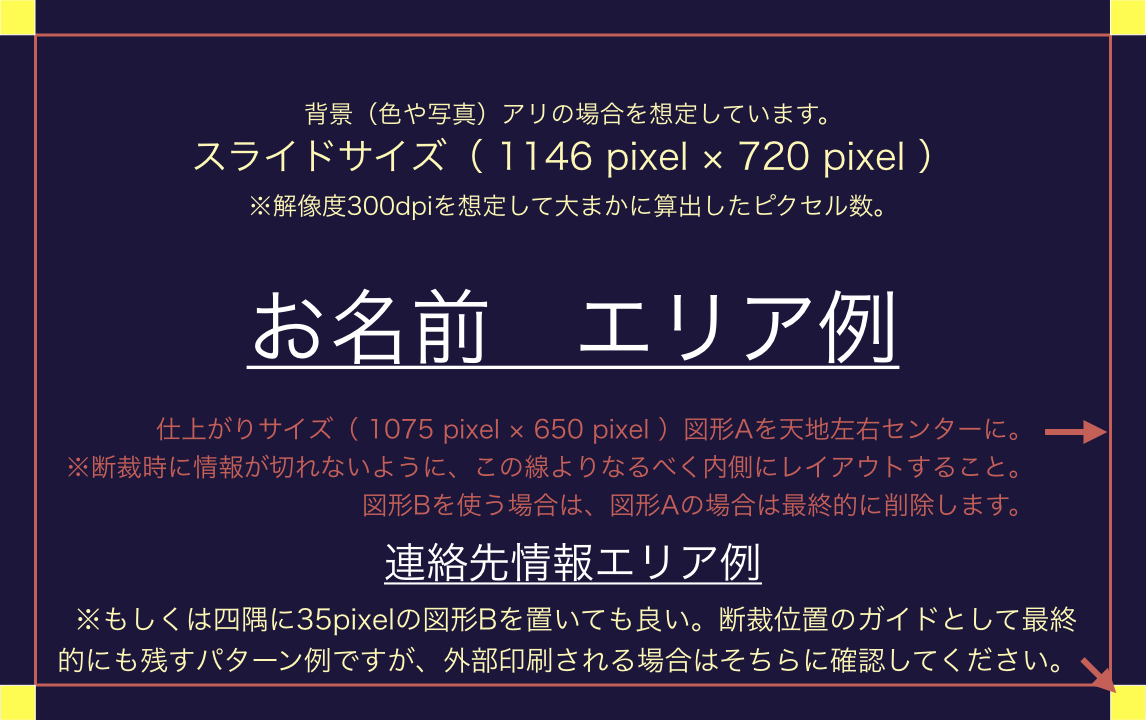 背景がない場合は、スライドサイズを仕上がりサイズの 1075pixel × 650pixel にすれば良いのですが、切り出すためのガイド(通常はトンボといいます)が必要になるので、 1146pixel × 720pixel で作成、図形Aの線を残して切り出しても良いかも知れません。