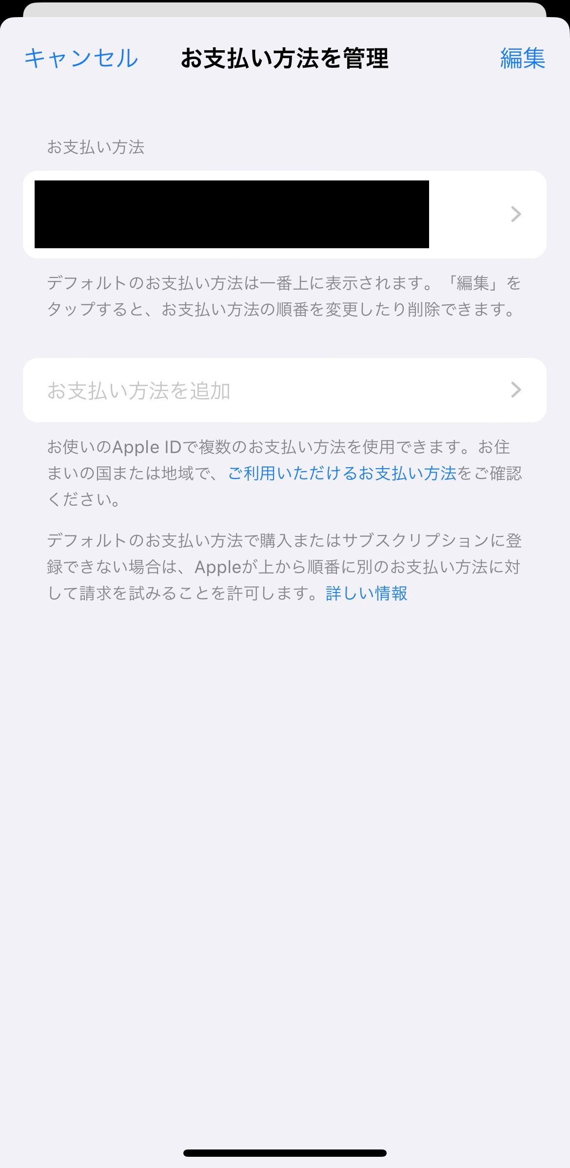 デバイスでスクリーンタイムが有効になっている場合、支払い方法を追加/更新するオプションが制限されている可能性があります。ペアレンタルコントロールの詳細については、この記事をご覧ください。お子様の iPhone、iPad、iPod touch でペアレンタルコントロールを使う - Apple サポート (日本)