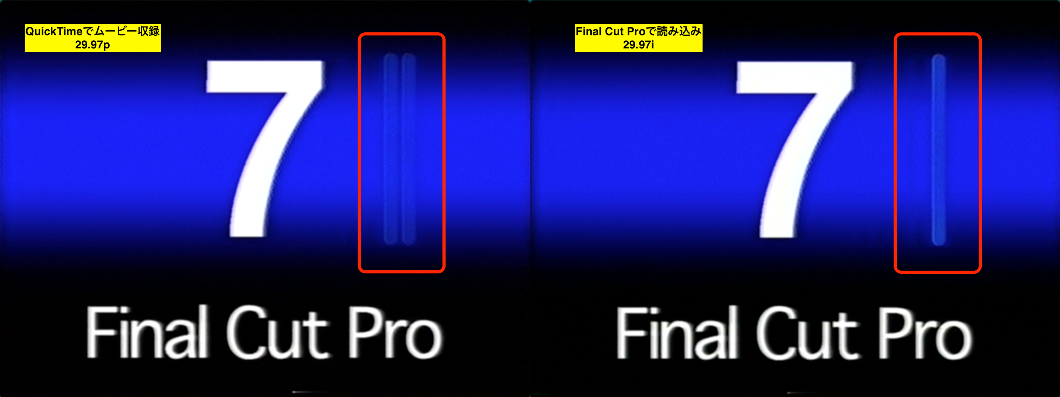 QTは29.97pでプログレッシブ、FCPは29.97iでインターレースです。