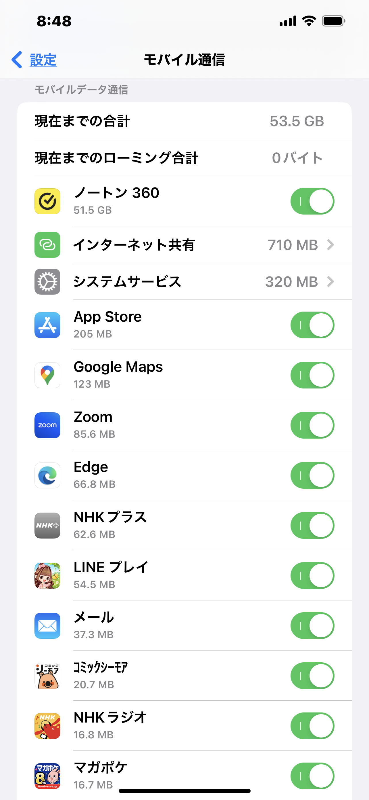 当方ソフトバンク・iPhone12ProMaxです。以前からノートン360及びセキュアVPNを入れて使用しています。普段はノートン360のみで、出先等で無料wifiに接続したときにセキュアVPNを起動させています。モバイル通信のスクショを添付いたしますが、いままで各アプリが使用したギガ量の合計がノートン360のギガ使用量として表示されていましたので、実際の使用量の倍程度の消費量を表示されている感じでした。しかし今回は特に動画を見たわけでも無く、使用していないにもかかわらず本体が非常に過熱する状態が頻発し、数日の間に日々4GB以上の消費量を記録しあっという間に月間制限量の50GBをオーバーしてしまいました。今までせいぜい15GB程度しか消費しなかったため驚いています。画像をご覧頂くと判ると思いますが、ギガ消費の多いアプリ順になっていますが、多くても1GB以下です、ここに表示がありませんがwifiアシストの使用量が250MB程度ですので、どう読み取ってもノートン360がギガを大量消費したとしか思えません。ソフトバンクから通信速度を低速にいたしましたと通知が来て、外出時には通話以外使い物にならなくなりましたので50GBを超えたのは間違いないですね。1年以上前から変わらぬ設定でノートン360を使用しているため、今月末に突如ギガ大量消費されて困惑しております。同じような経験の方もしくは解決された方がいらっしゃいましたら、ご教示いただけるとありがたいです。よろしくお願いいたします。
