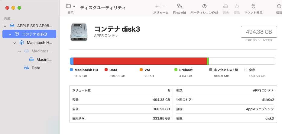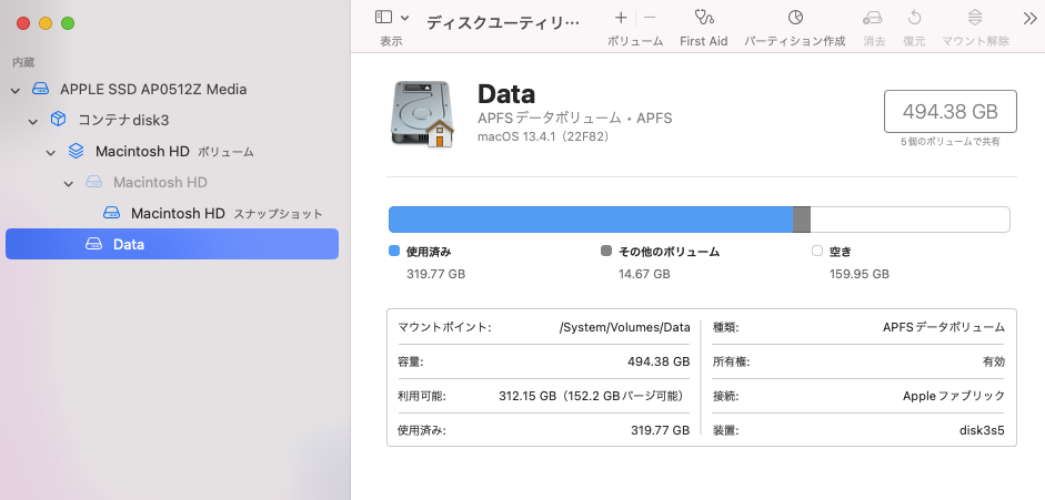 ディスクユーティリティで見えてる使用済み領域が320GBほどで差がありすぎるのがおかしく思います。