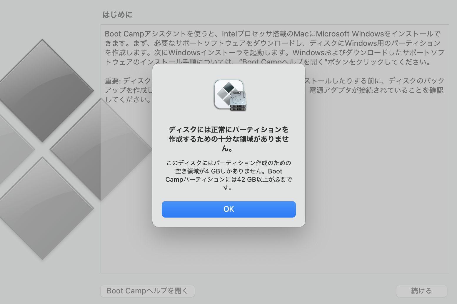 macbookに以前Bootcampを使って入れたWindowsを削除しようと思ったのですが、Bootcampアシスタントを開くと、「ディスクには正常にパーティションを作成するための十分な領域がありません。」が表示されて先に進めません。何か方法はあるのでしょうか?