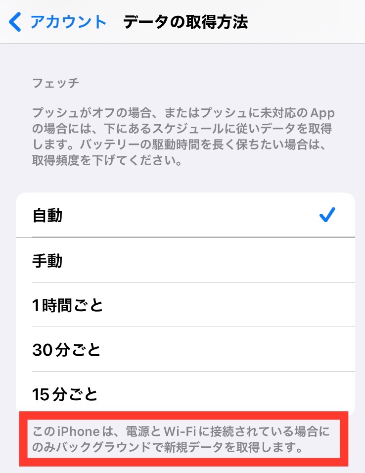 設定>メール>アカウント>データの取得方法のところにある「自動」の意味は、友佳子275さんが書かれているとおりのようですね(ここにチェックを入れると下の方に「このiPhoneは〜」という説明が表示されます)。