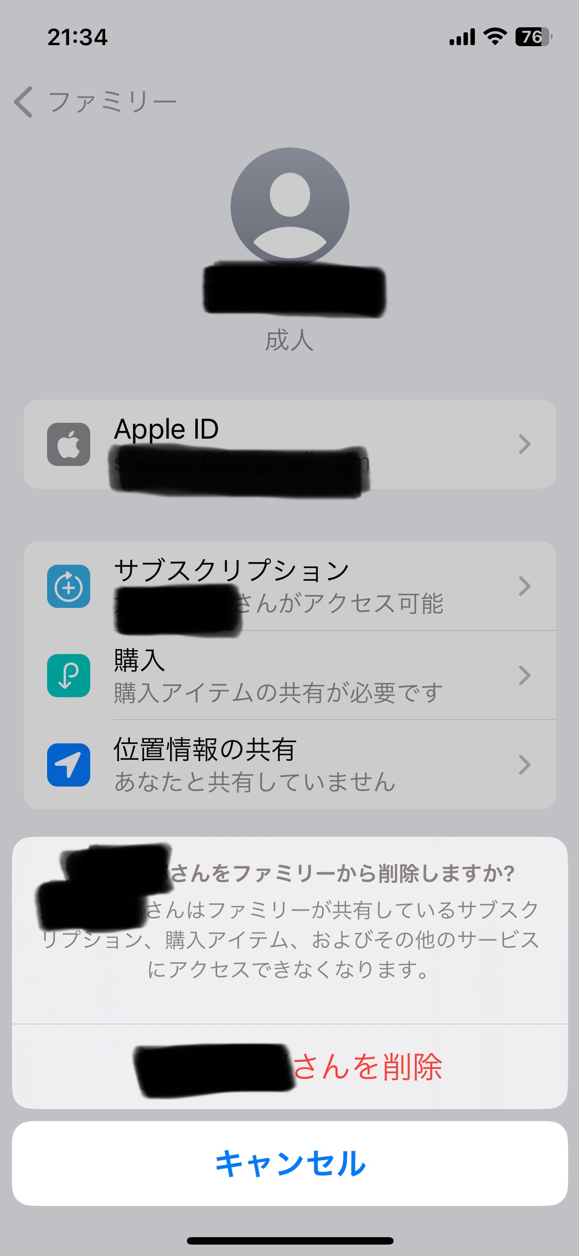 ファミリー共有のメンバーを削除できません