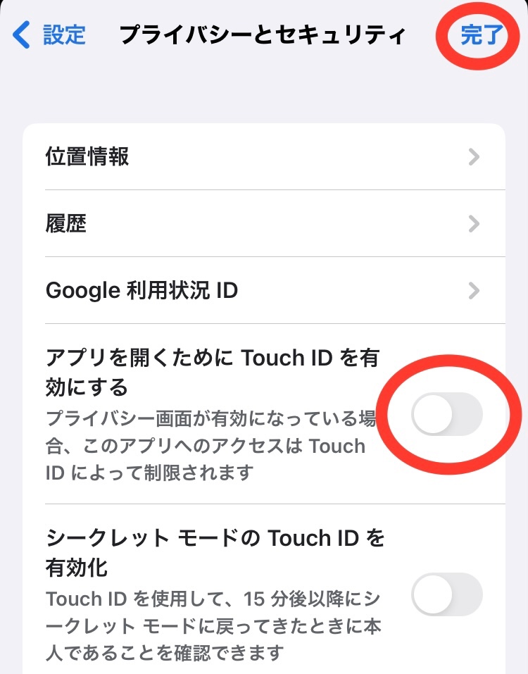 画面右上の丸いアイコン > 設定 > プライバシーとセキュリティ > アプリを開くためにTouch IDを有効にする をオフ > 完了