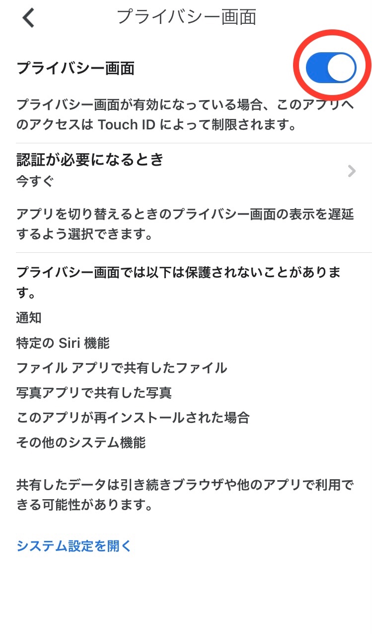 画面左上の≡ > 設定 > プライバシー画面 > オフ(注1) > 画面上に「プライバシー画面を無効にする」(注2)と表示されたら、Touch IDセンサー(ホームボタン)を押す と解除できます。