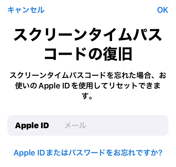 以前スクリーンタイムパスコードを設定時にApple ID とパスワード、両方を入力しましたか?