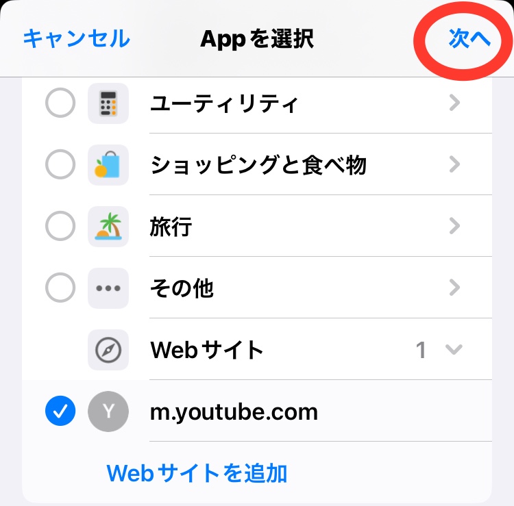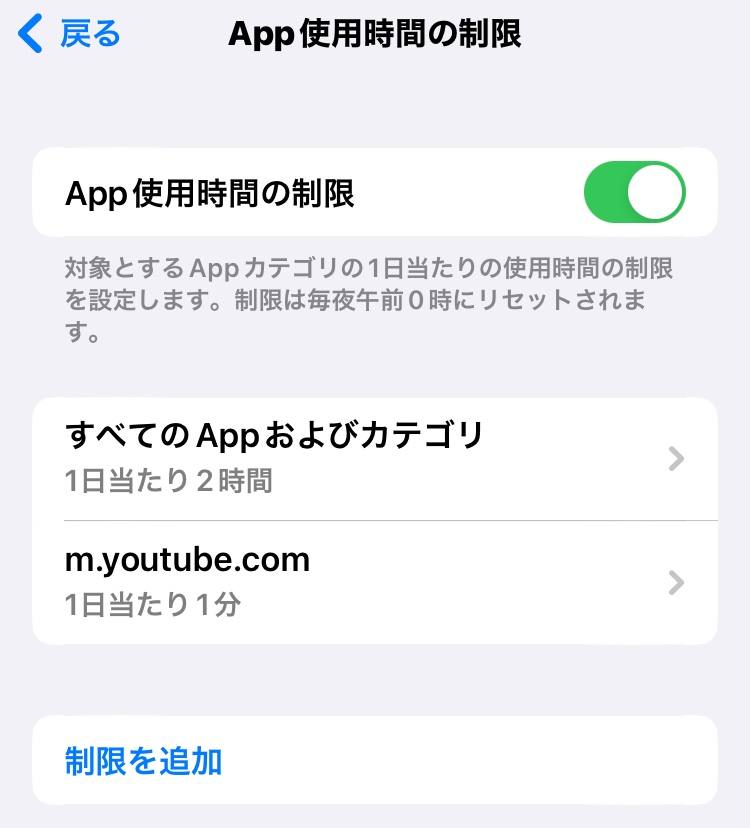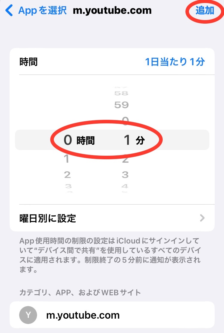 設定>スクリーンタイム>App使用時間の制限>Webサイト>Webサイトを追加>m.youtube.com と入力>次へ>1分>追加