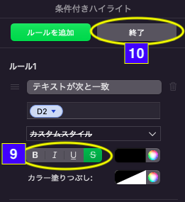 ですが、Numbersの条件付きハイライトでも、自セルと他セルの比較結果で自セルの書式を変更することはできるので、少し工夫をすればA列のチェックの有無でB列のテキストに取り消し線を引くことは可能です。