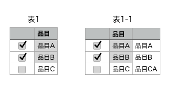 上図 表1は、A列にチェックを入れるとB列のテキストに取り消し線が引かれるようにしてあります。取り消し線だけだと目立たなかったので背景色もグレイにしました。
