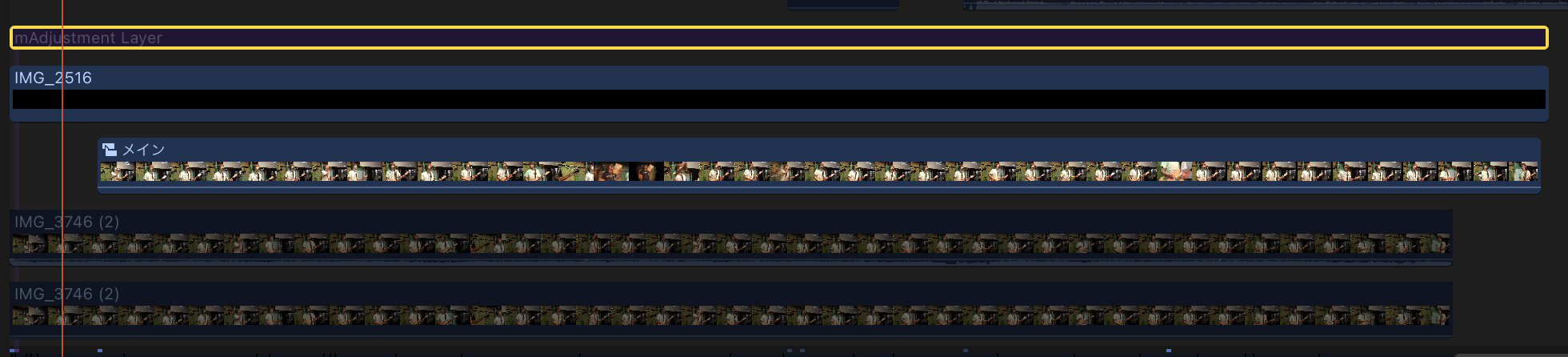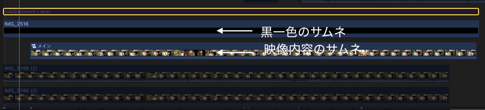 他クリップ3つ(複合クリップ:メイン、静止画:IMG_3746(2))は、内容をカラーでサムネ表示して、IMG_2516は黒いサムネ表示なのが証拠だと思います