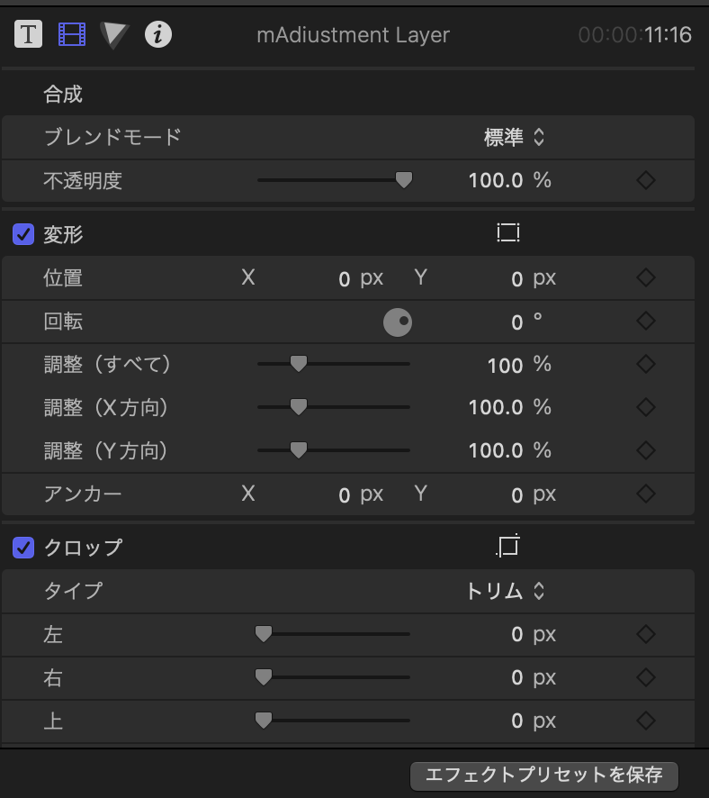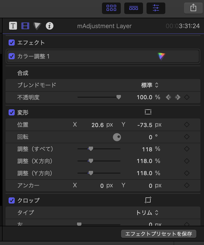 調整レイヤー(mAdiustment Layer)の、ビデオインスペクタ(画像詳細)を、スクリーンショットで見せて下さい