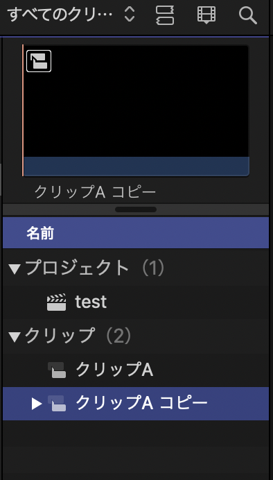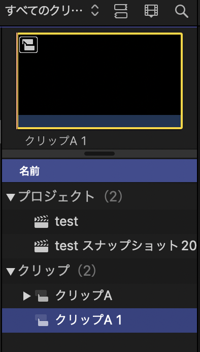 スナップショットとは、オリジナルプロジェクトに全く影響を及ぼさない、安心して好きなだけ試す事のできる、テスト用プロジェクト。スナップショット内で変更した、複合クリップA(クリップC+E)選択 →新しい親を作成:shift+F →ブラウザに[複合クリップA 1]が作成される*名称変更しておきましょう