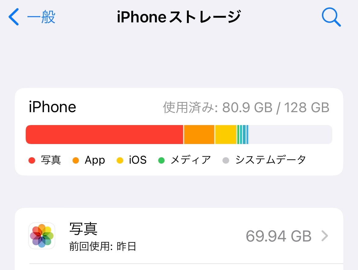空き容量はまだあるのですが、iPhoneに保存している写真や動画の枚数に比べて、ストレージに記載してある写真容量が極端に多くなっているのです。