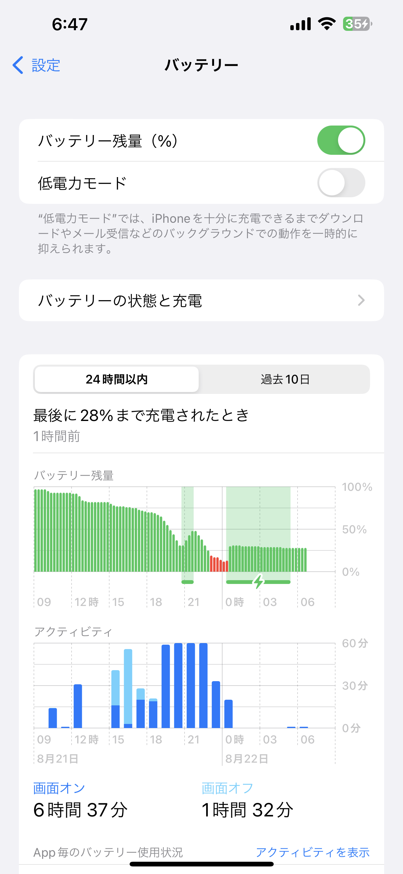 毎日ですね、昼間は100%まで充電出来るんですが、夜充電して寝て起きたらこんな感じです。