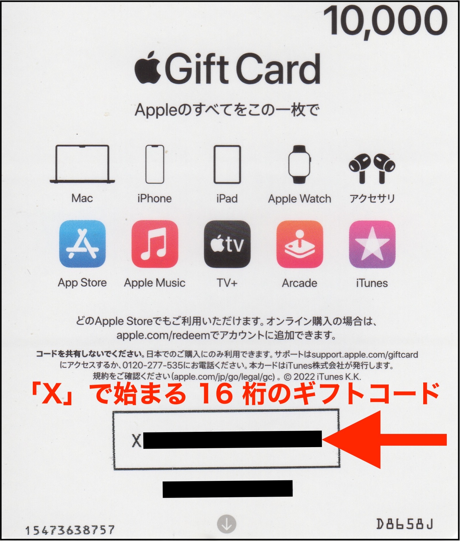 下の画像の様に、黒枠で囲まれた「X」で始まる 16 桁のコードが、Apple ギフトカードのコード になります。