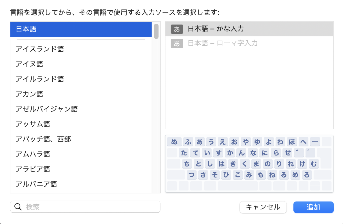 システム環境設定→キーボード→テキスト入力の入力ソース「編集」→すべての入力ソース「+」