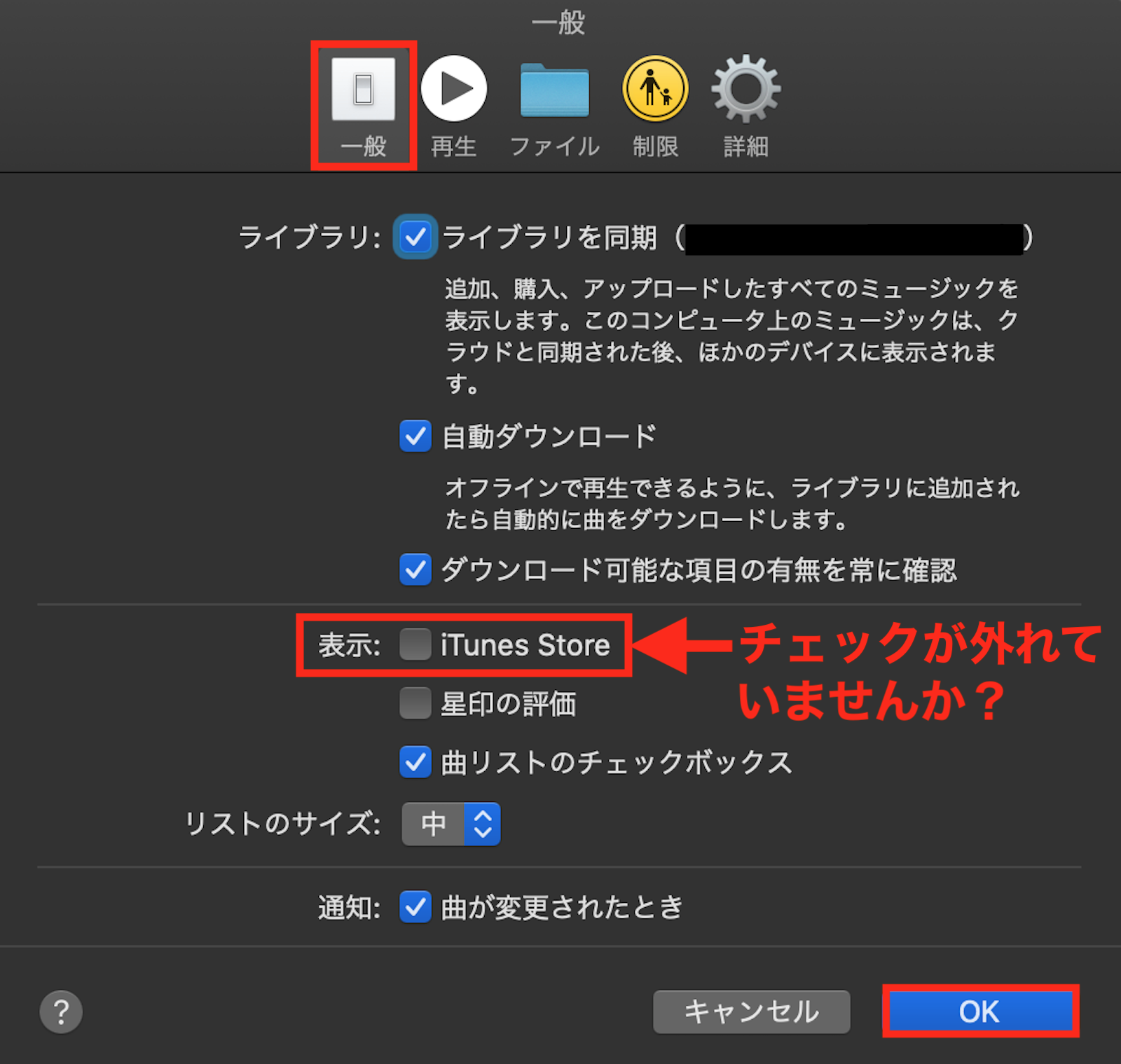 (チェックが外れている場合は、「iTunes Store」の項目にチェックを入れて「OK」ボタンをクリックして下さい。 そうすると、「ミュージック.app」のサイドバーに「iTunes Store」の項目が表示されますので、選択して下さい)