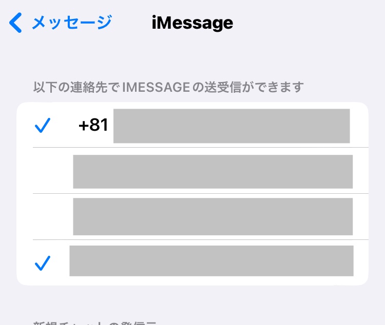 また、相手のデバイスで設定App>メッセージ>「送受信」の項目でiMessageの送受信の連絡先として指定(✔︎)している宛先にあなたが送信しないと緑色になってしまいます。