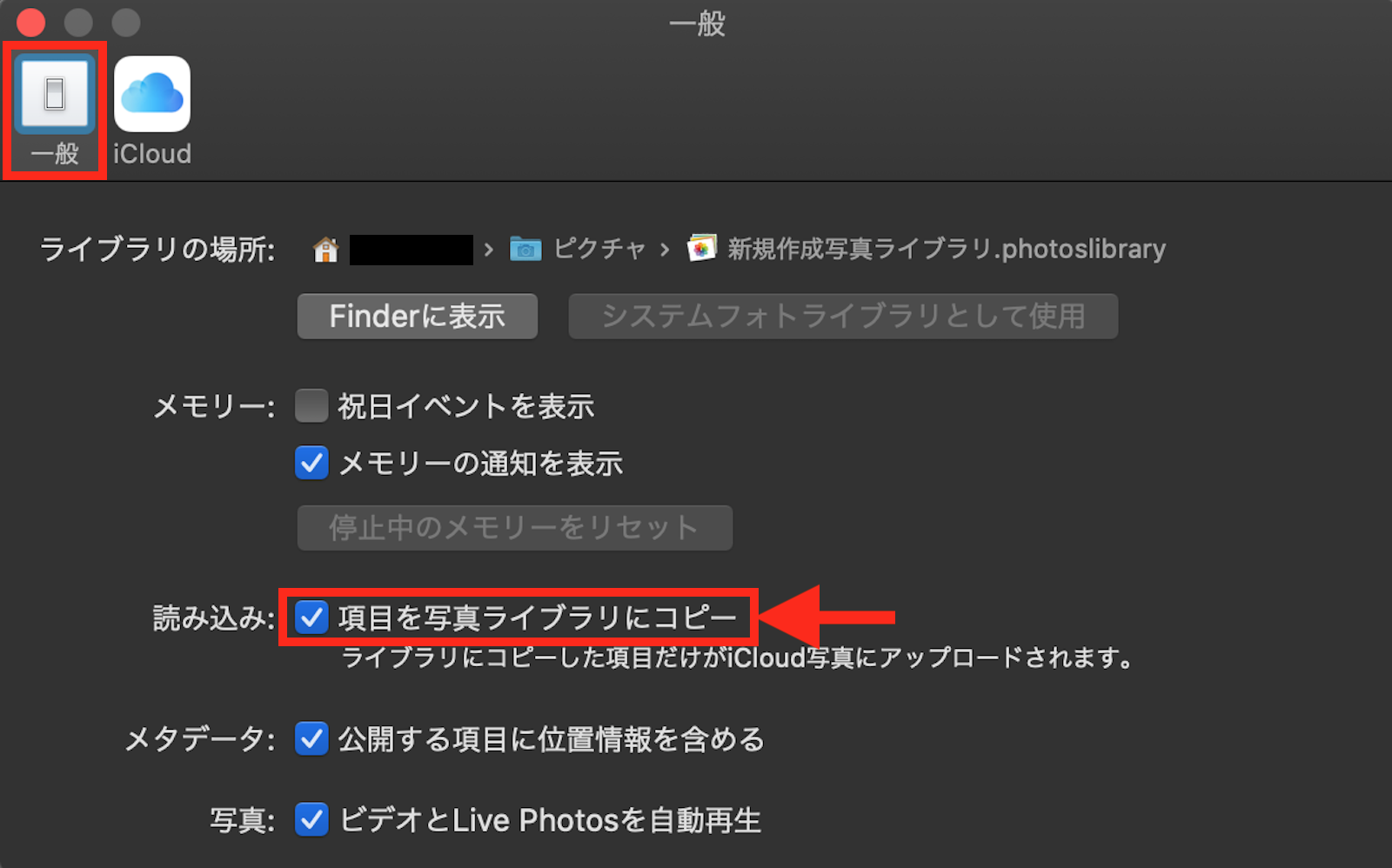 >また、MacBook Pro と MacBookAir の双方で、「写真.app」の 「写真」メニュー >「環境設定」>「一般」タブ >「読み込み:」>「項目を写真ライブラリにコピー」の項目 は、どの様に設定されていますでしょうか?
