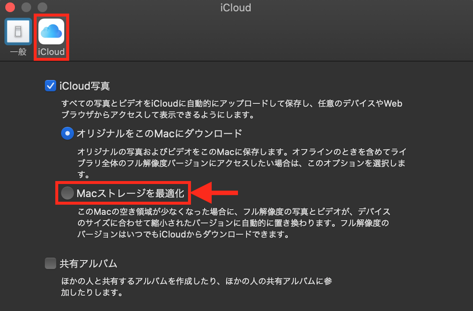 >他にも、「写真.app」の 「写真」メニュー >「環境設定」>「iCloud」タブ >「iCloud 写真」>「Mac ストレージを最適化」の項目 に、チェックは入っていますでしょうか?