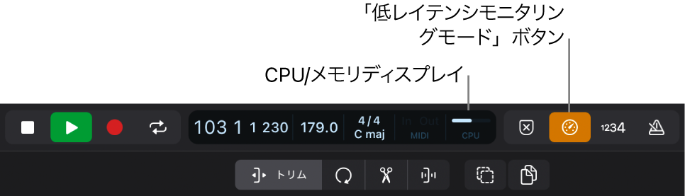 • コントロールバーのCPU表示は、プロジェクトでの再生または録音時に、プロセッサに対する要求がどの程度高いかを示します。 「CPU/メモリ表示をタップして、CPUやメモリの使用率を表示します。