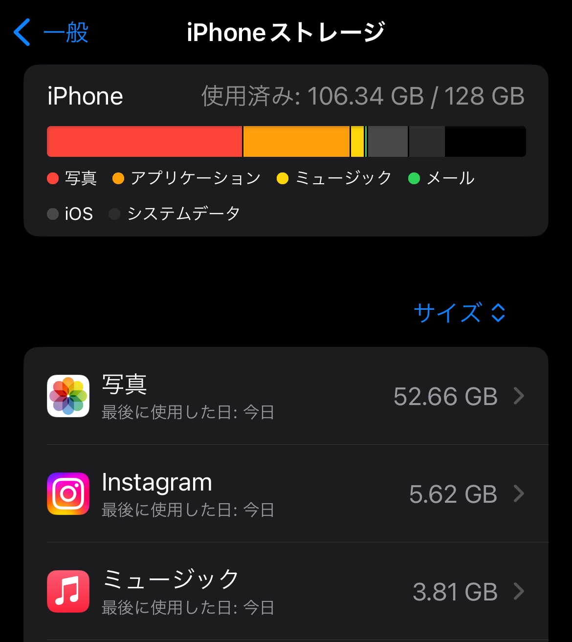 iPhone ストレージのカメラロール容量 - サイズが合わない