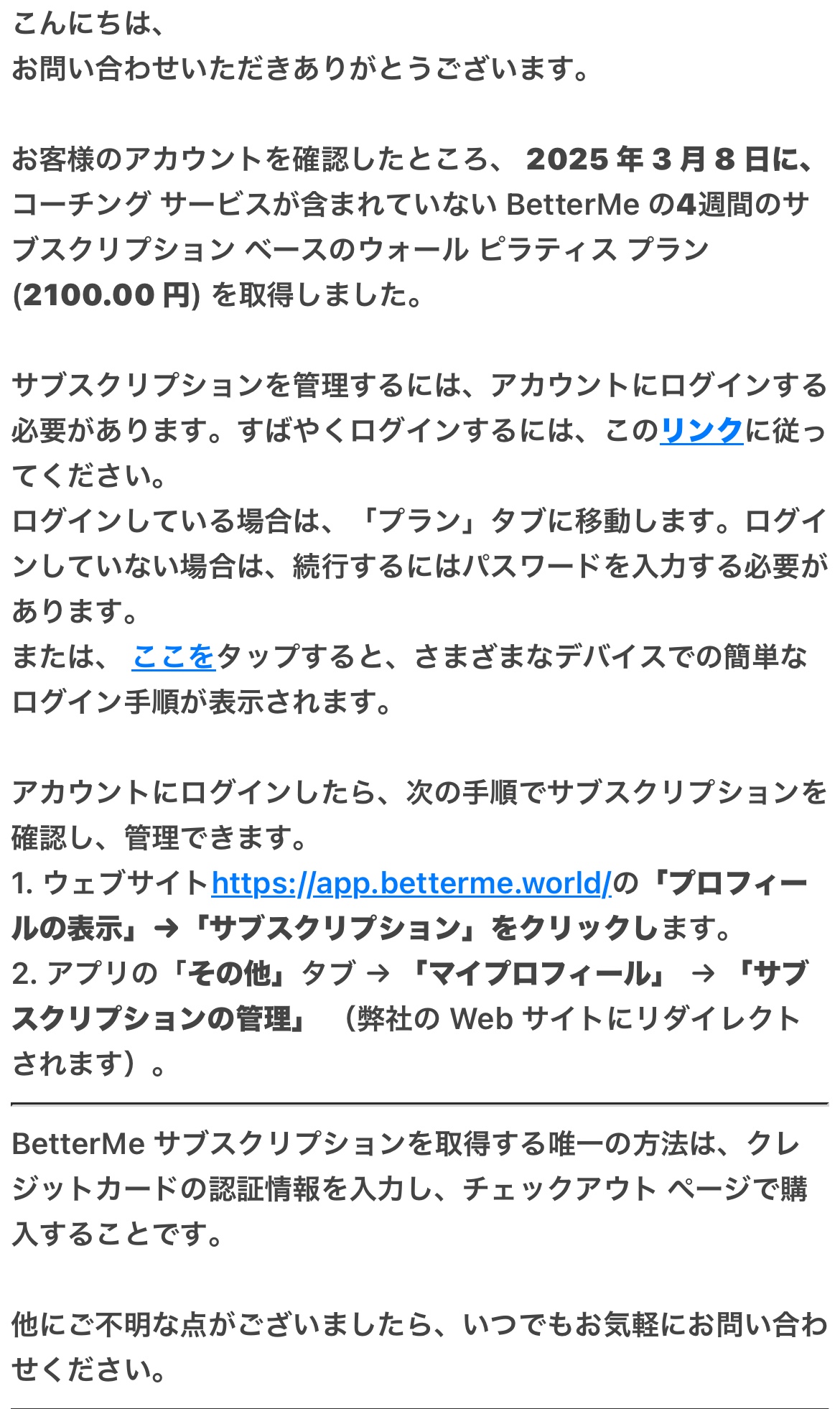 アプリ、またはネットから日本語版で、better me に入り→詳細設定→ヘルプ→ご請求に関するお問い合わせ
