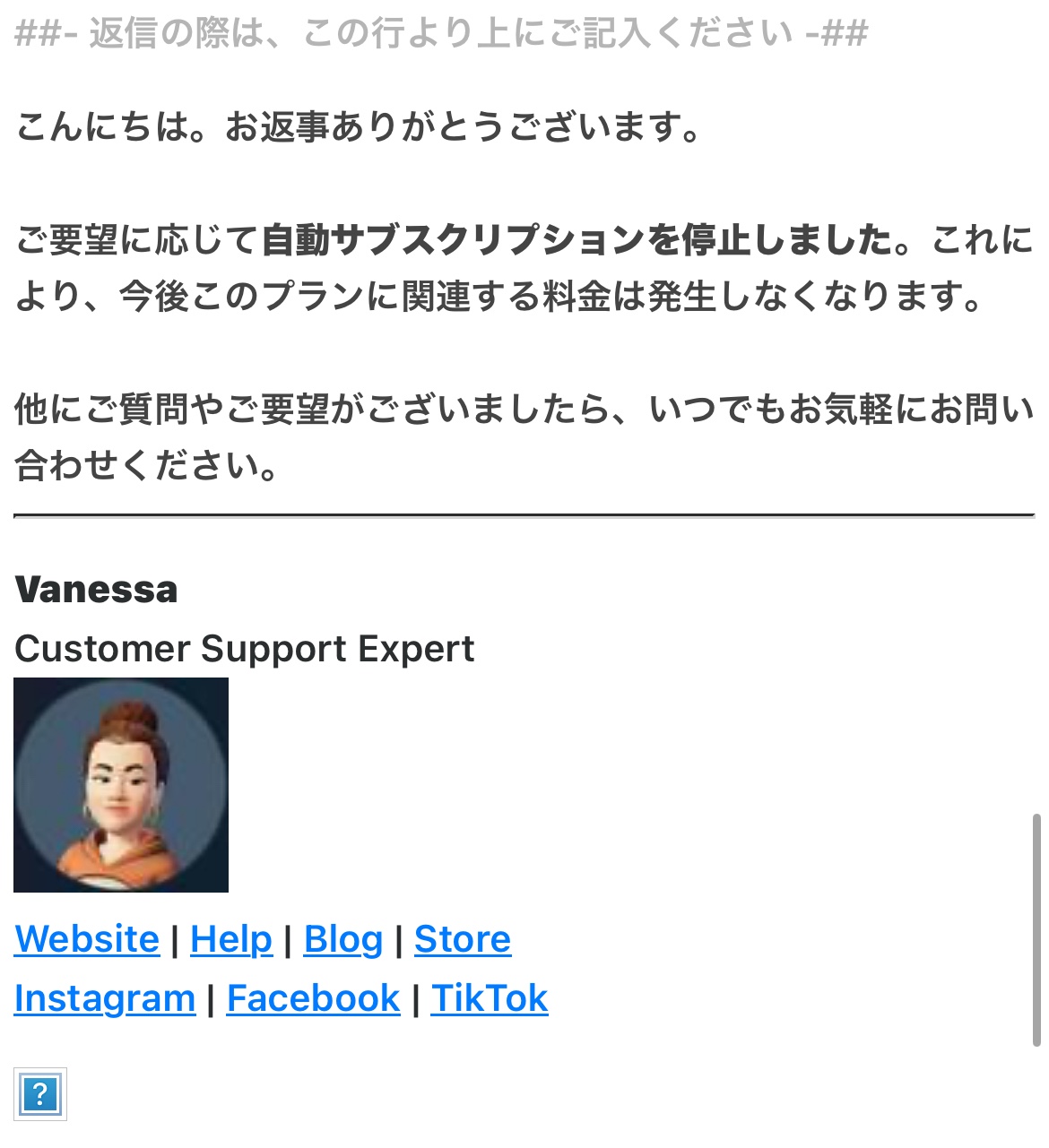 私の場合、すぐに英語で返信があり、【解約の場合、以下をクリックして】というメールが届き、そこからまたログインに入って無事に解約できました。