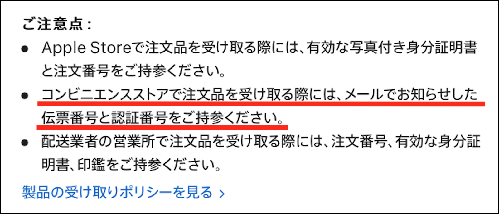 また、上記リンクには記載されていませんが、製品の注文時に「ご希望の受け取り方法は?」のページで、「お客様がご自身で受け取る」を選択し、受け取るストアを選択して受け取りの詳細に進むと、「受け取りに関する情報を入力してください。」のページの「ご注意点」の項目に、以下の様に記載されていますので、ファミリーマートで受け取る場合は、「本人確認証」は必要無い様です。