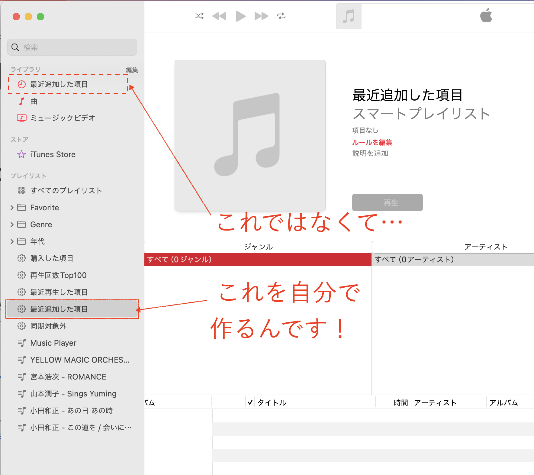 「最近追加した項目」は、「ミュージック」に最初からついているプレイリストのことです(ですよね?)。ここ数年間で新たに追加してきた音楽たちが追加順に表示されていたので、重宝していました。「追加した順番に表示される(降順で)」というのが欲しいところなのですが、スマートプレイリストには、追加した順番に表示する方法がないような気がします。どうしたものでしょうね…。