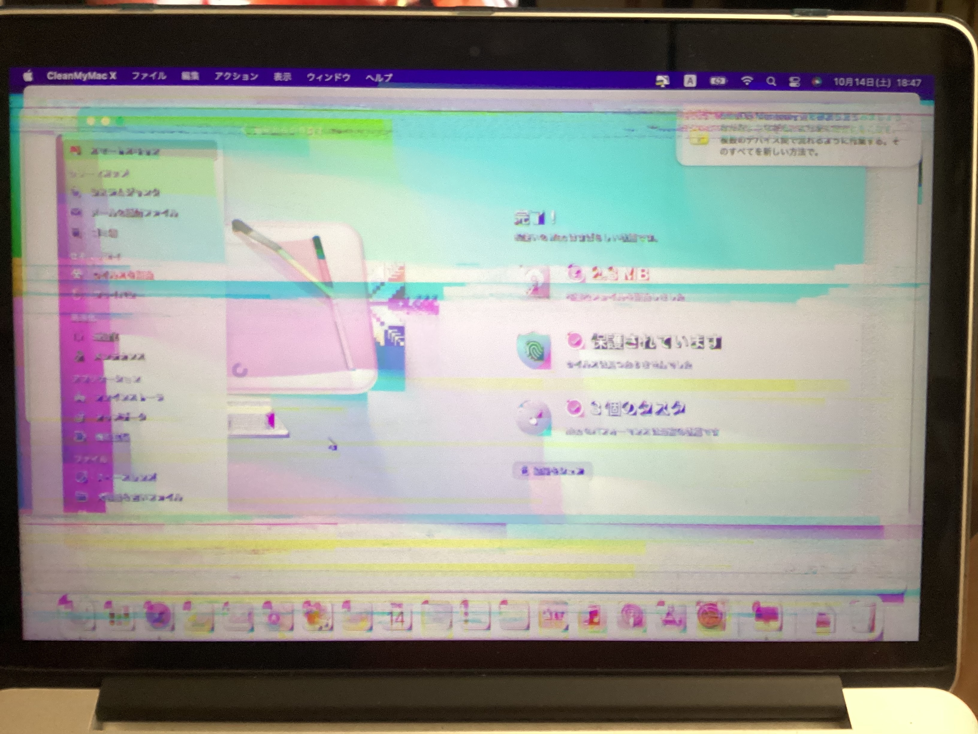 画面の異常。 工場出荷時まで戻す。 PRクリア、SMCクリアしても直らない。コマンド+Rでの起動後の画面では異常は出ない。 アプリ『CleanMyMac」を起ちあげていると異常が出ない。 ジニアスに尋ねたが原因不明でした。