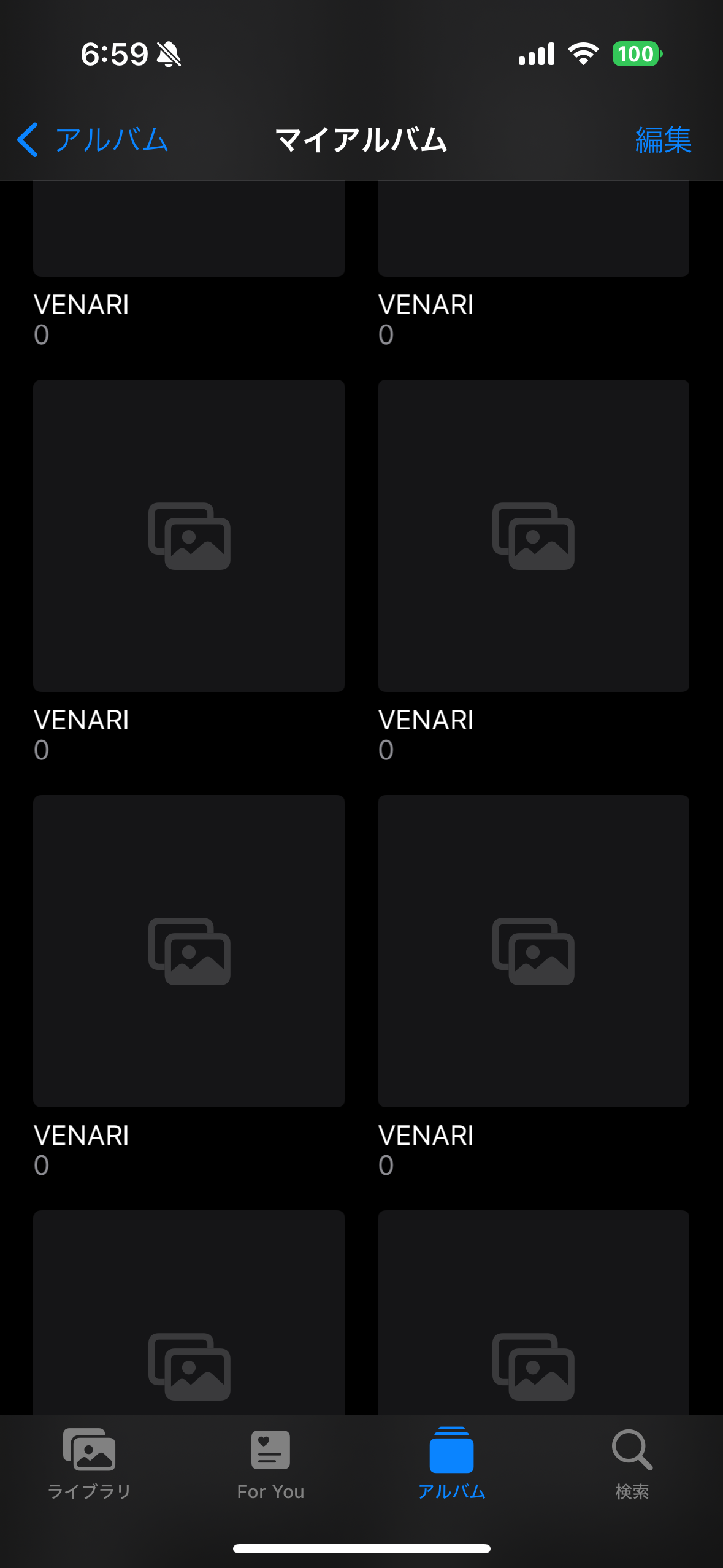 iPhoneの写真アプリを開くと、「VENARI」という写真の入っていないアルバムが大量に出来上がっていました。どうやら、同名のアプリが勝手に作り上げたようです。