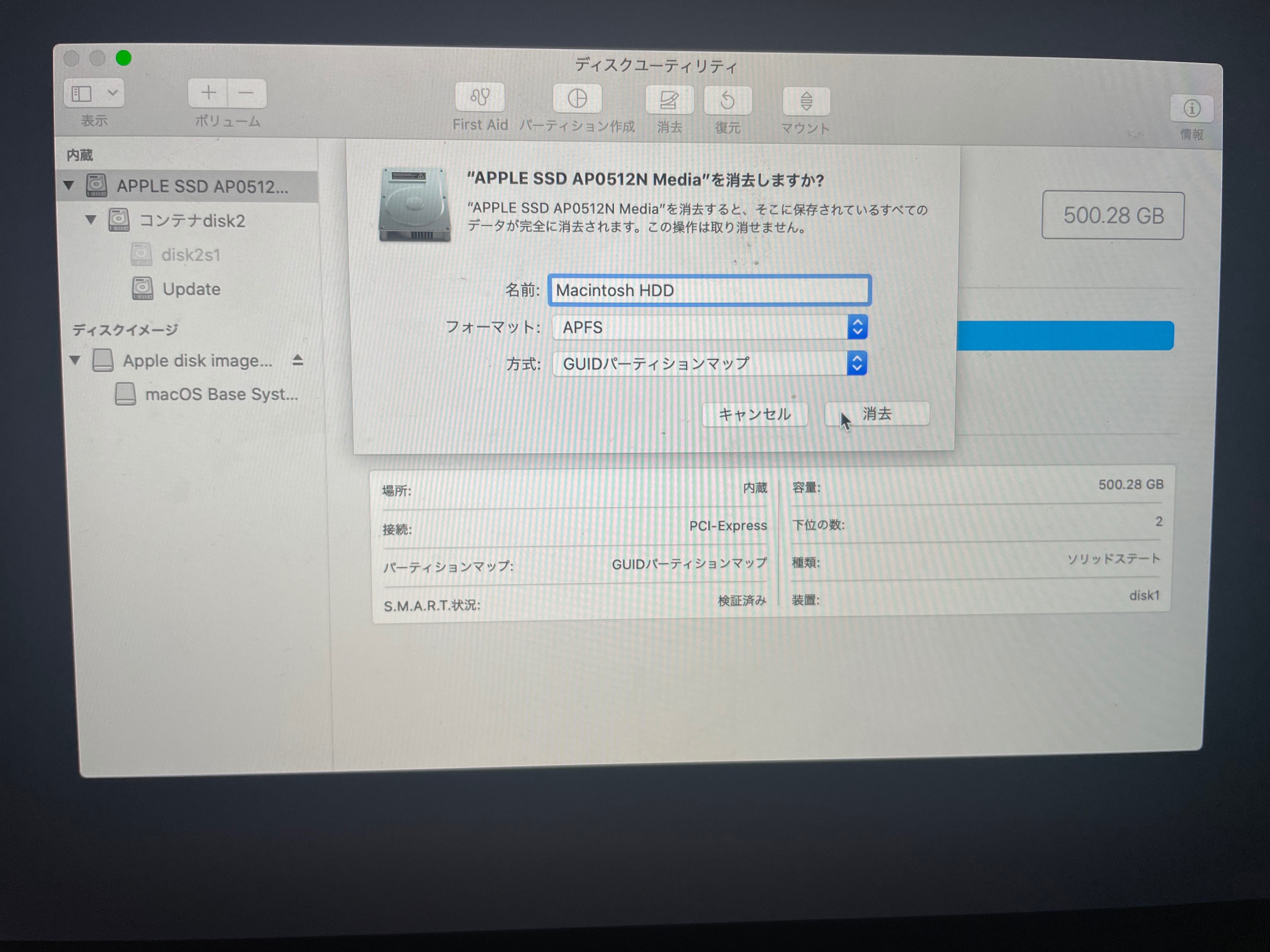 初期化の手順に従って、ディスクユーティリティからMacintosh HDを消去したのですが、MacOSを再インストールする→同意する→インストールするディスクを選択してください のところでディスクが何も表示されず白紙のままになっています。