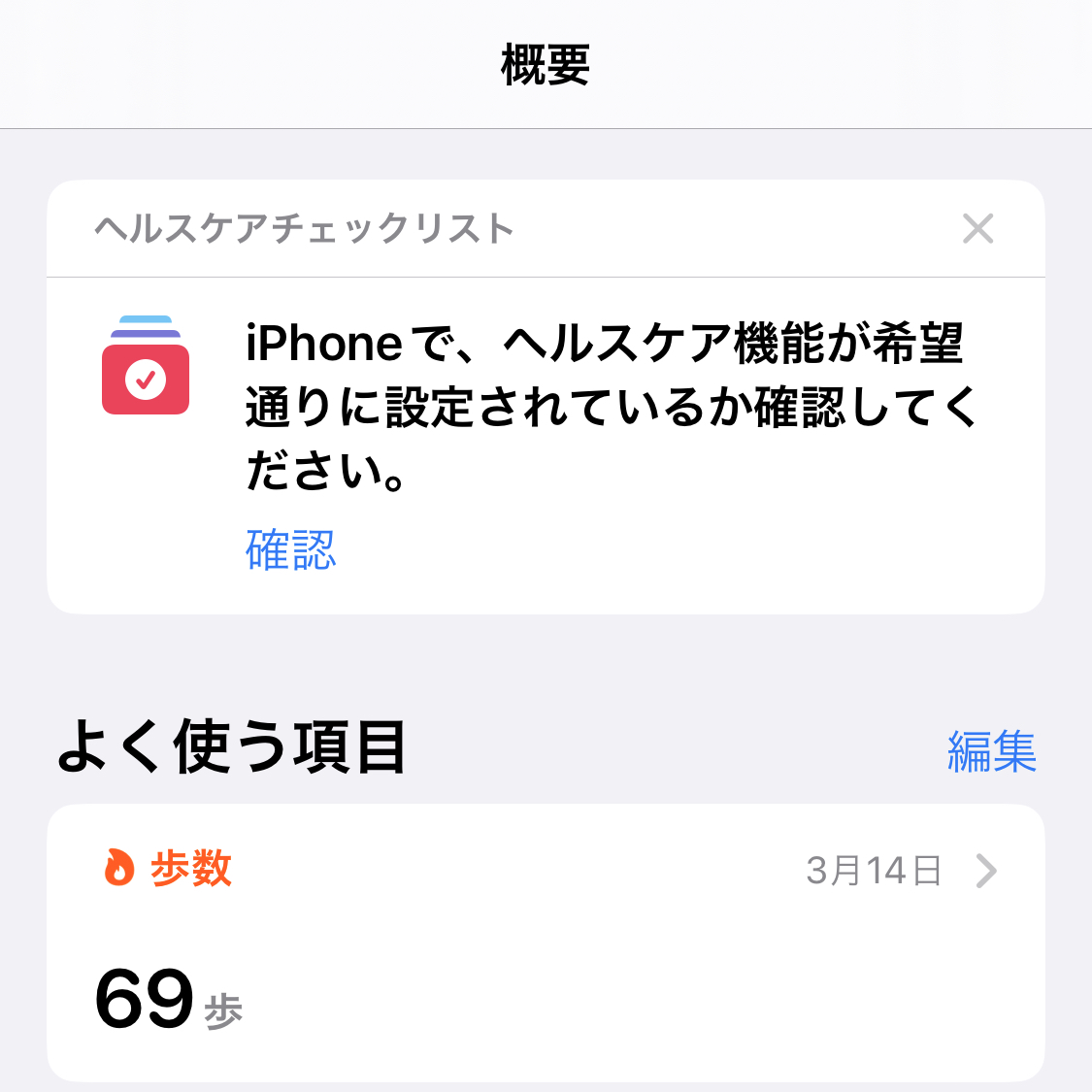 ヘルスケアアプリを開いた際に表示される今日の日付が3/14となっています。
