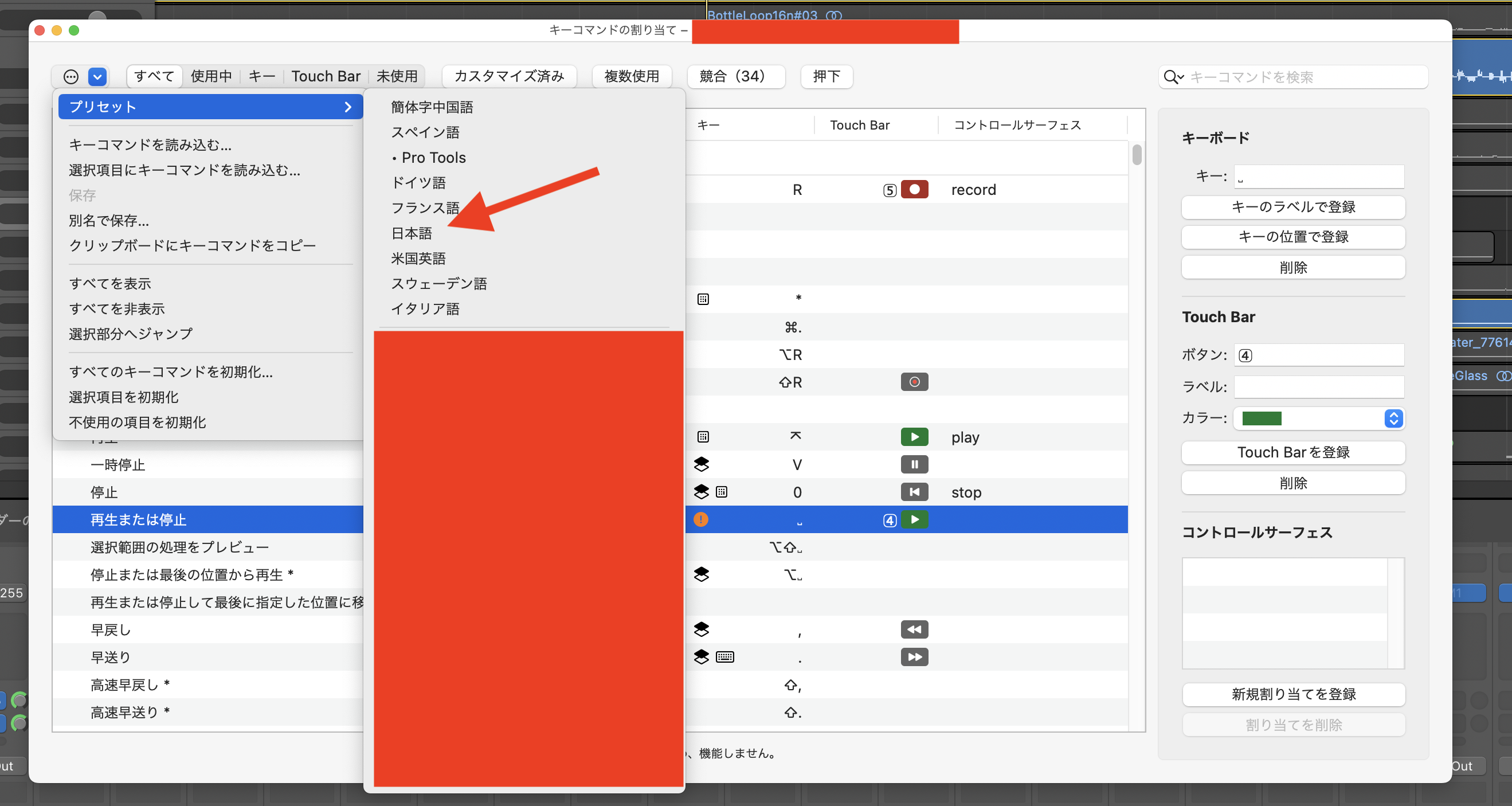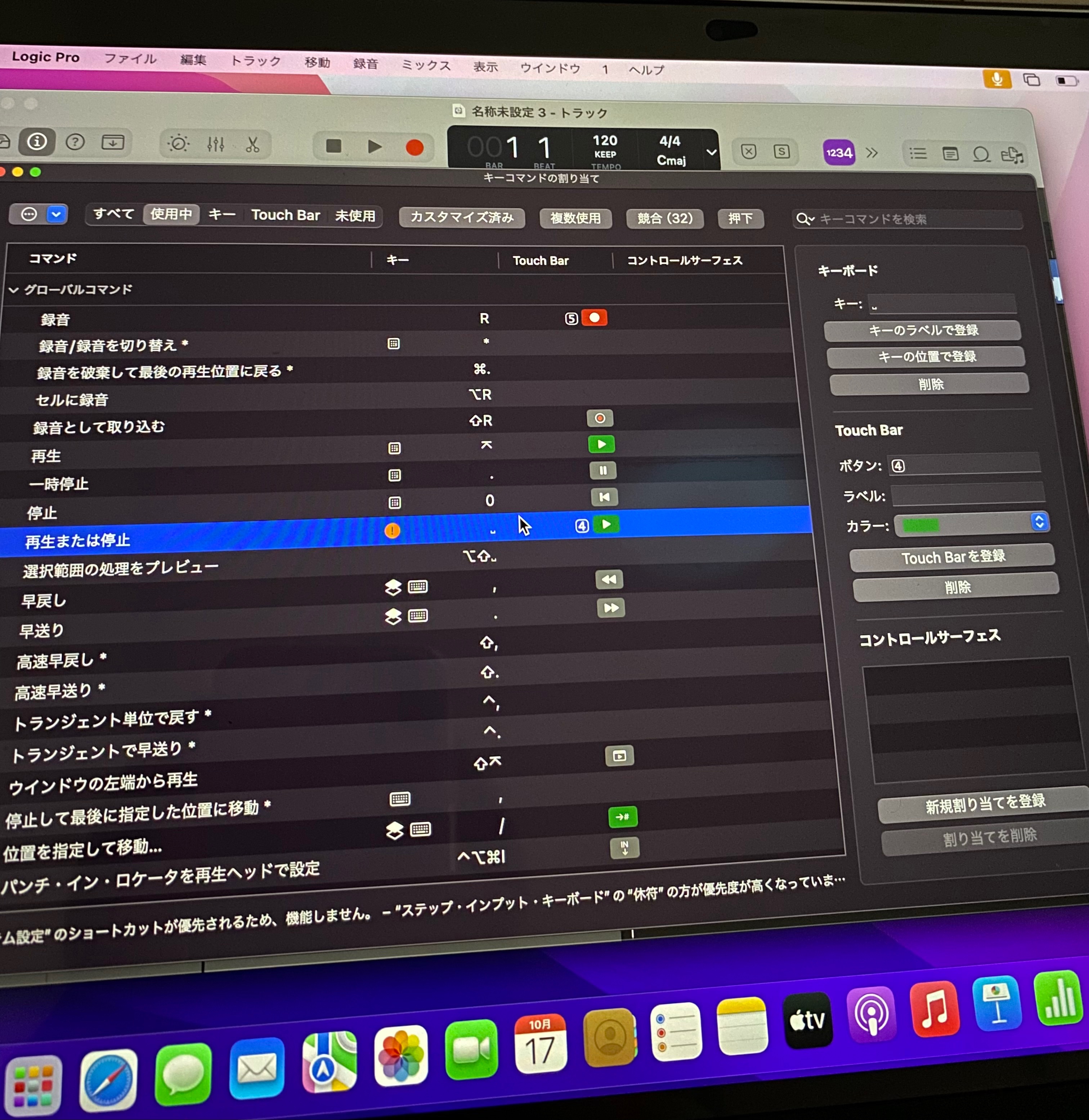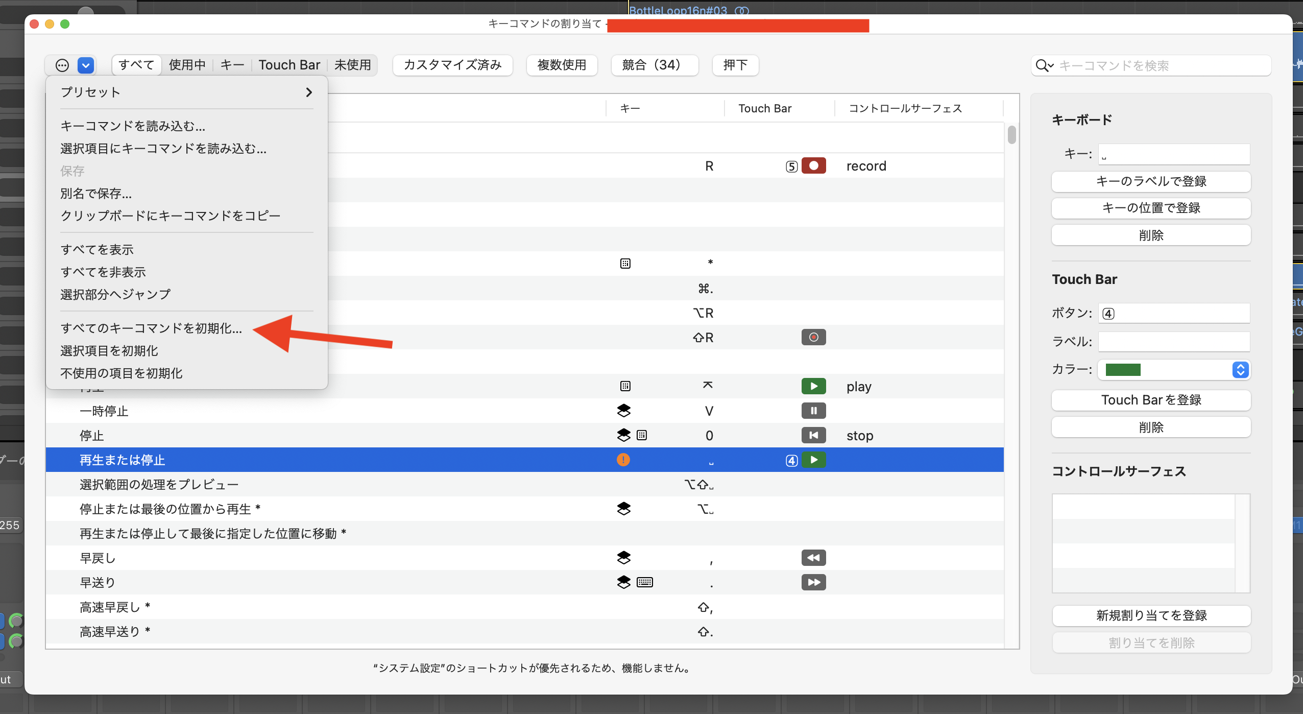 以前はスペースキーで再生、停止していましたが、できなくなっていました。キーコマンドの設定にいくと、ステップインプットキーボードの休符が優先されると表示されたので、休符の方のコマンドを消しました。すると今度はシステム設定のショートカットが優先されると表示されたので、システム設定のショートカットを全てオフにしました。それでもスペースキーで再生できませんでした。どうしたらいいでしょうか。
