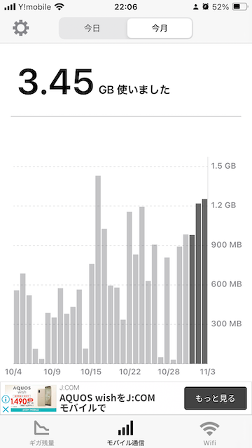 一方、「設定」>「モバイルデータ通信」のデータ表示では14時間で26.2GBとなっており、うちインターネット共有が25.1GBとなっていますが、確かにインターネット共有は使ってはいますが相当不正確と思われ、「My Softbank」アプリでのデータ通信量も3日間で3GBとなっており、「ギガ残量」アプリでも冒頭に記したように1GBという記録になっていることからすれば、「モバイルデータ通信」の表示の方が不正確ではないかと考えています(ここ数日間、毎日インターネット共有で30GBくらい使ったことになっていますw)。