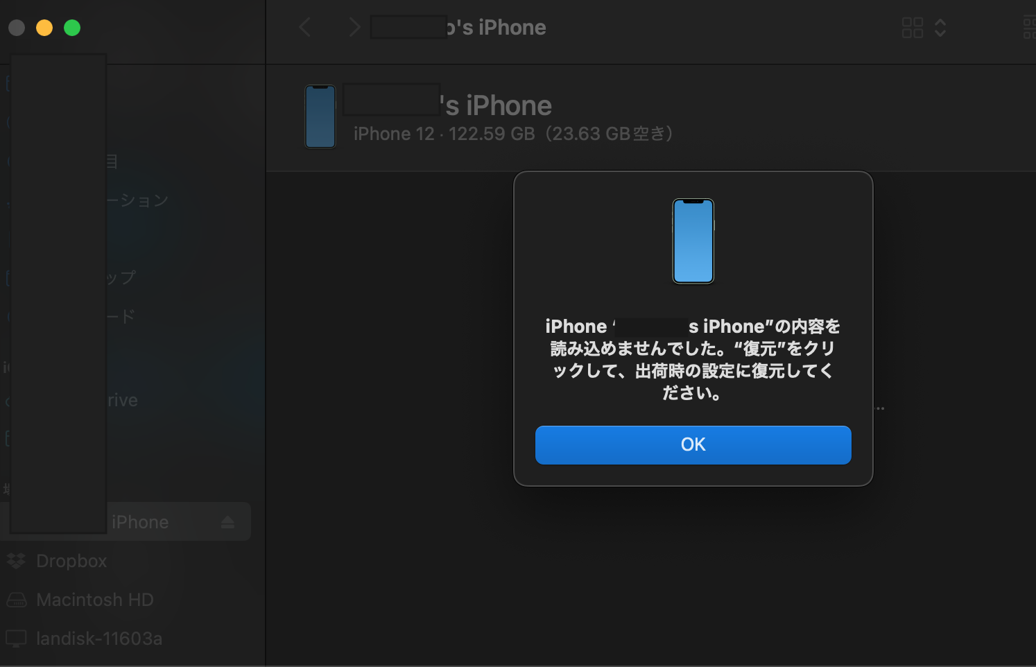 接続すると、Finderでもミュージックアプリでも同様のエラー表示が出てiPhoneの内容が読み込めません。