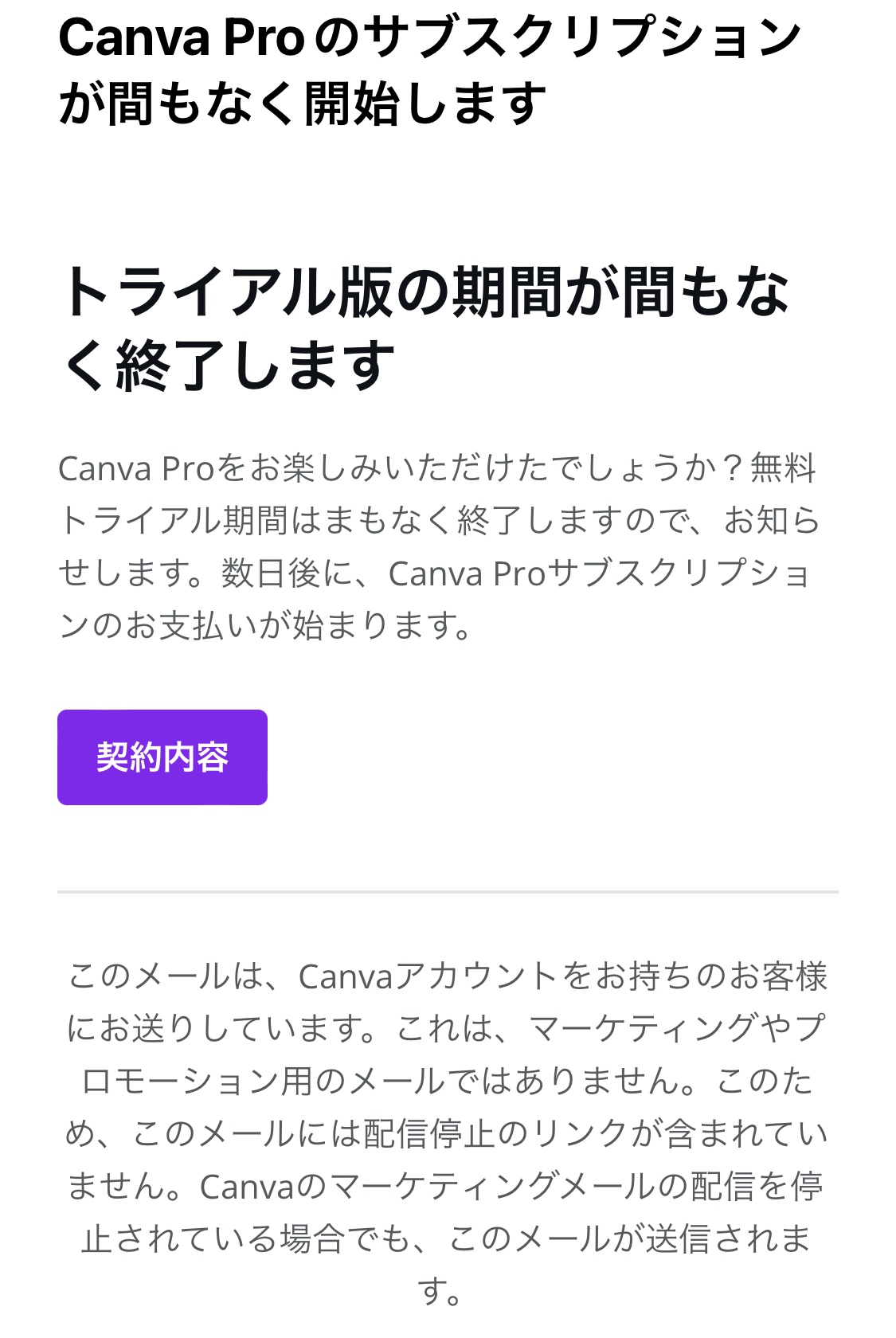 するとこのような画面になり、自分は解約したと思っていたのですが、後日トライアルの残り日数と、解約しなければ自動的に有料コースに移行する旨のメールが届きました。